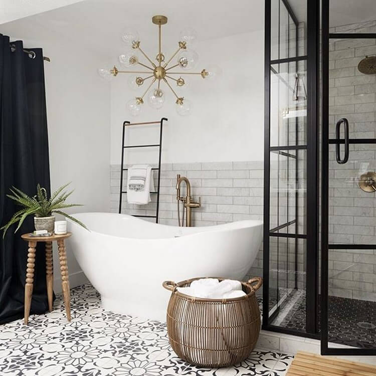 The rich blend of white and grey in the bury makes the room look longer. It is insignificant with is white freestanding bath and dull hanging vanity. The huge metal frame likewise makes the space look greater. This bohemian bathroom has a loosening up feel on it.