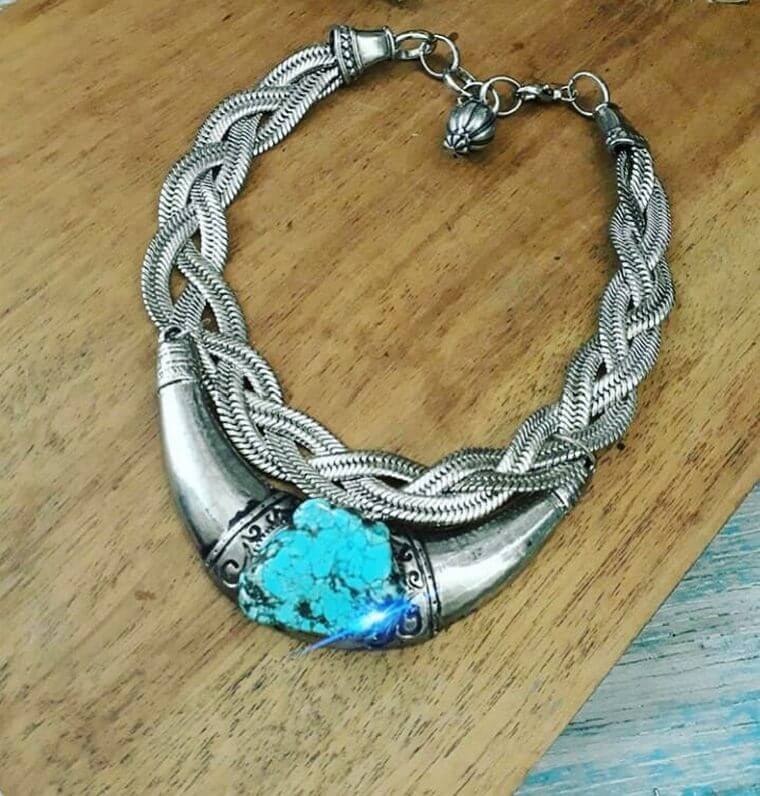 Genuinely something unique to use in any gems piece. This flexible small neckband is made of delicate certifiable calfskin or Vegan fake softened cowhide string with closures embellished with dots and turquoise spikes. An announcement piece with silver sleek bangles that will run with such a large number of various outfits.