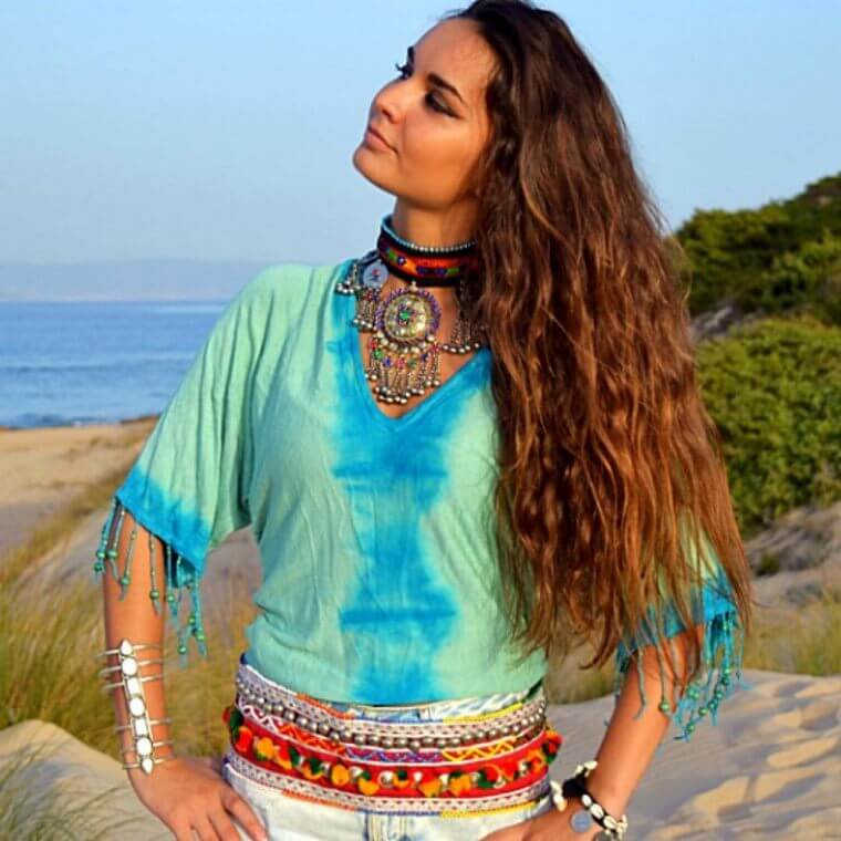Complicated DIY boho looks with metal necklaces, rings and bangles in picture underneath. Hues are a prominent material in boho adornments. You use hoop fish snares, bounce rings and calfskin ribbon line to make these, alongside globules, charms or different embellishments. These are incredible in light of the fact that whether you like silver or gold, you can redo them to your inclination.
